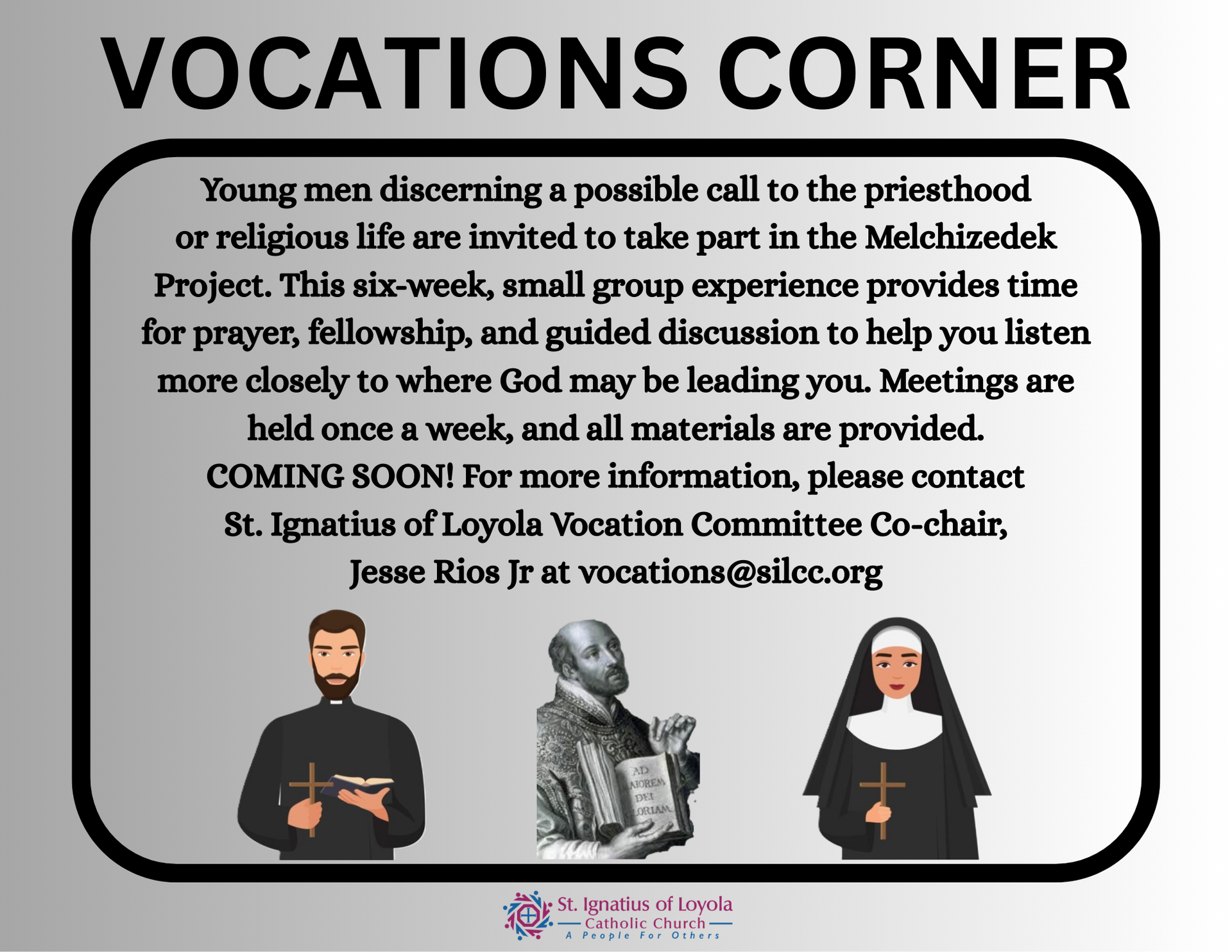 Through the guidance of the Holy Spirit and the intercession of Our Blessed Mother, the Vocations committee seeks to inspire the parishioners of St. Ignatius of Loyola Catholic community to foster vocations to the priesthood, the religious life and the permanent diaconate and to assist and nurture those who are seeking or have answered the call to ordained ministry and religious life through our prayers and support.
